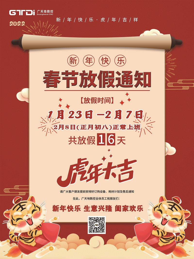 2022年春节将至,首先感谢您在2021年里的鼎力支持和愉快合作,广天地数控全体同仁在此给您拜个早年。在新年的一年里,K8凯发电子将更加努力,为您提供更优质的服务。按照国家春节放假规定结合我司的具体情况,春节放假时间安排如下: