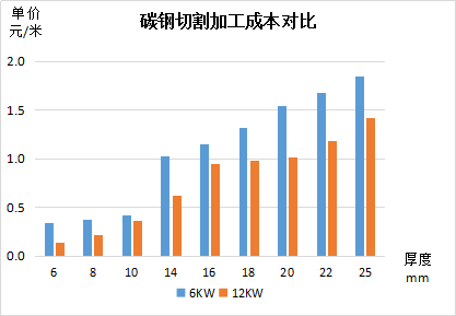 从以上数据可见:对比6KW激光加工成本,12kW激光切割成本基本都可以保持降低一半以上,其中不锈钢优势最大,其次是碳钢、铝。切割不锈钢时使用空气作为辅助气体,单价加工成本最 低,可以满足对切割端面要求不高的产品。