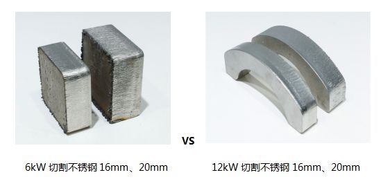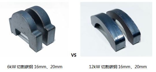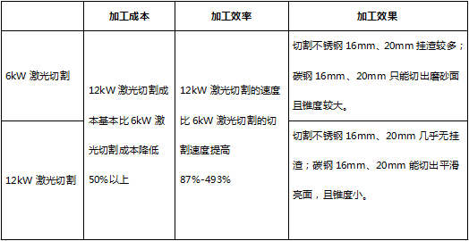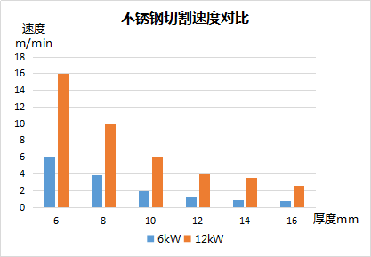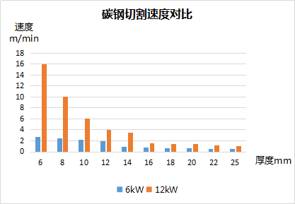 从测试的切割速度得出: 切割碳钢时,12kW激光切割的速度比6kW激光切割的切割速度快87%—493%;切割不锈钢时,12kW激光切割的速度比6kW激光切割的切割速度快163%—289%;切割铝时,12kW激光切割的速度比6kW激光切割的切割速度快150%-213%。